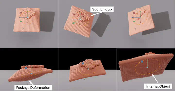 Deformable packages are becoming increasingly prevalent in the logistics and warehouse industry, demanding robotic manipulation strategies that are robust and adaptive. Unlike rigid objects, these packages undergo significant shape changes under external forces, making their handling more complex. These deformable packages are often manipulated using suction cups and contain internal objects that shift during transport, introducing additional complexity. To ensure safe and efficient robotic manipulation at scale, high-fidelity simulation is crucial to support automated robot trajectory generation. In this work, we present a physics-driven simulation framework that accurately models multi-object deformable packages, capturing package deformations, suction-cup interactions, and internal object dynamics. Our approach employs a hyperelastic model to accurately simulate package-object interactions, including contact forces, suction-cup interactions, friction, and material deformation. By leveraging high-fidelity physics, we optimize simulation parameters using real-world trajectory and package deformation data, ensuring an accurate representation of package behavior. Running in real-time, our framework reduces real-to-sim discrepancies, making it viable for real-world deployment. Additionally, we develop a parallelized simulation environment for large-scale reinforcement learning and trajectory optimization, paving the way for scalable, efficient, and adaptable robotic manipulation of deformable packages in diverse warehouse settings.